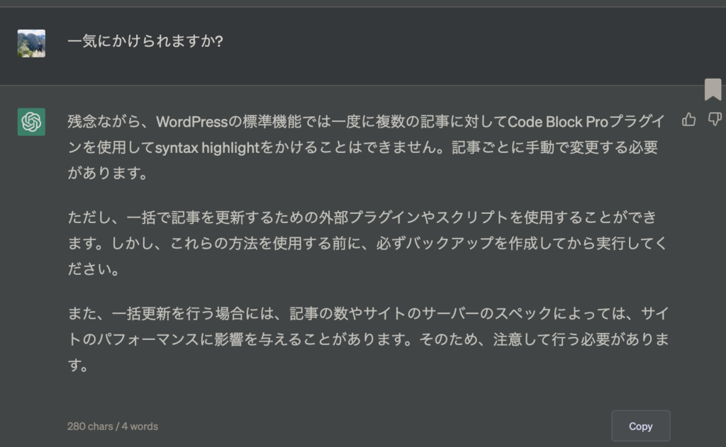 よーわからんけどいけるっしょ! と思って実行したら全部記事消えました。そこからはもうGPT-4の言うことは何も信じれず…全部Googleで調べてバックアップを復元しました。。。