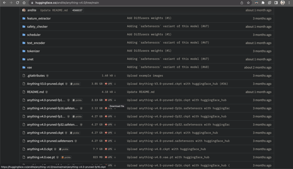 ダウンロードするだけデフォルトのモデルが入っていて動かせるのですが、何かに特化したモデルの方が綺麗に生成できると思って、andite/anything-v4.0をダウンロードしてimportしました