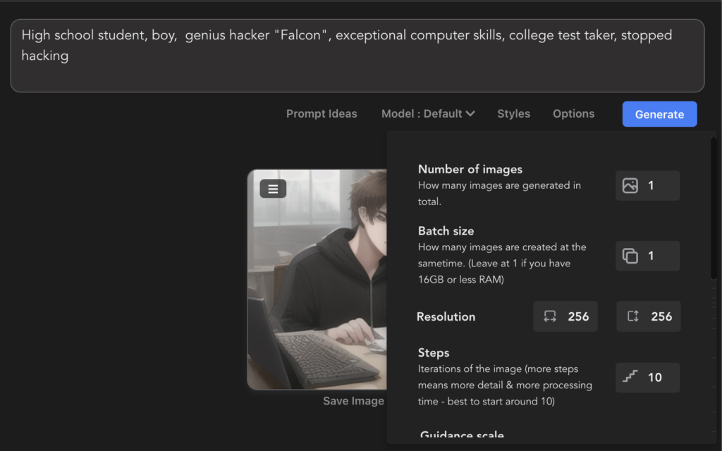 自分のPCが雑魚いのか、Resolutionは256x256でStepsは10にしないと真っ黒な画像が生成されてしまったので注意してください🙏