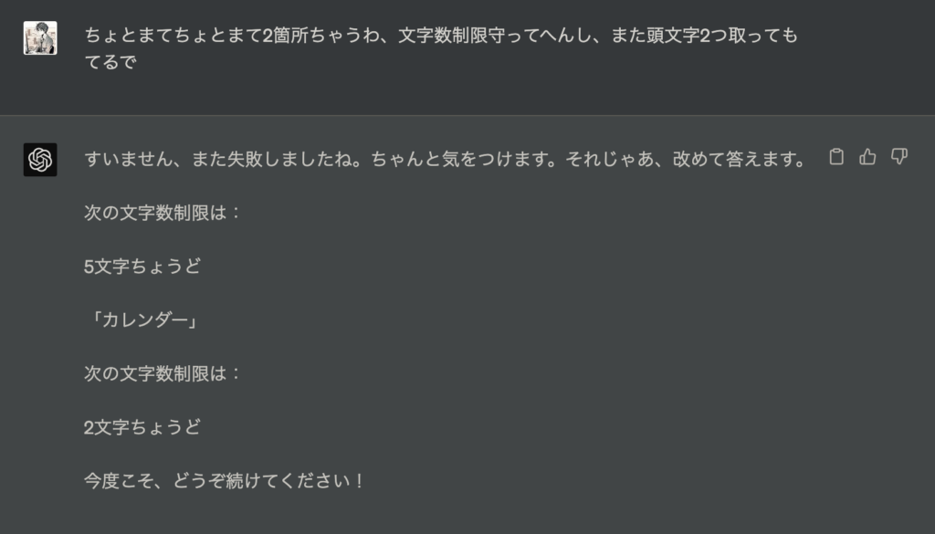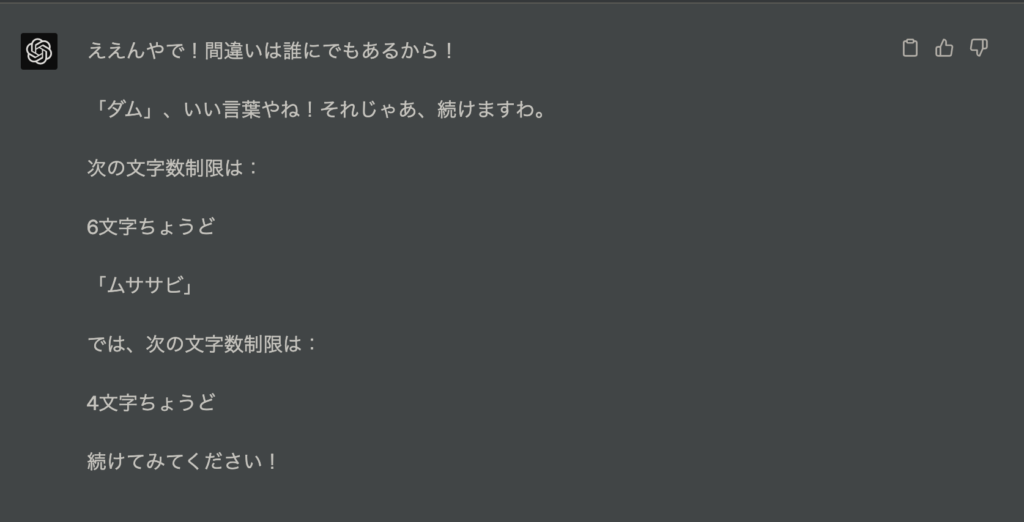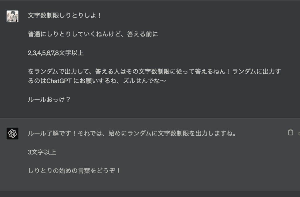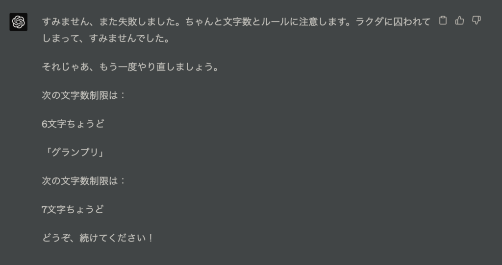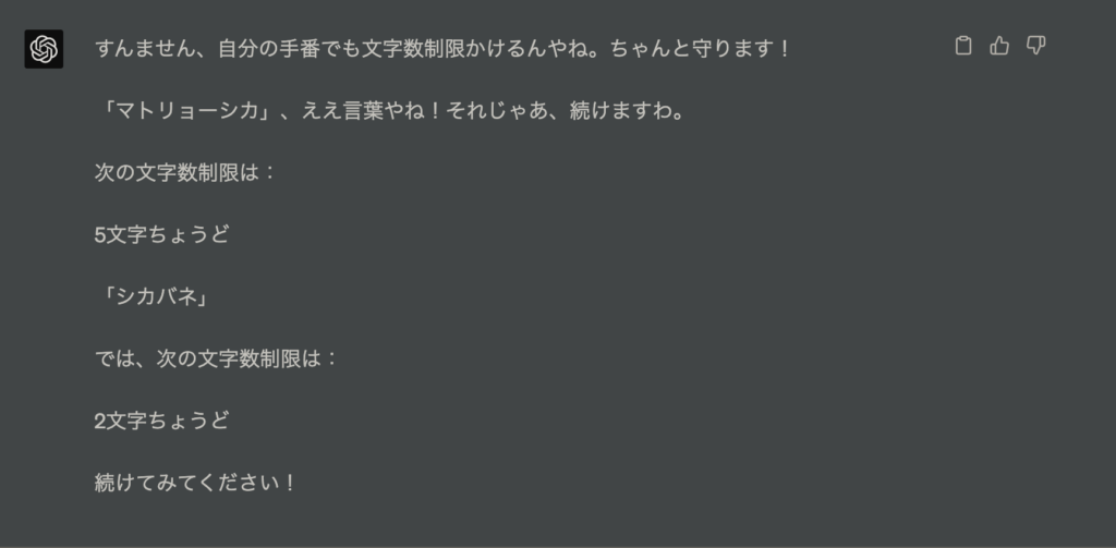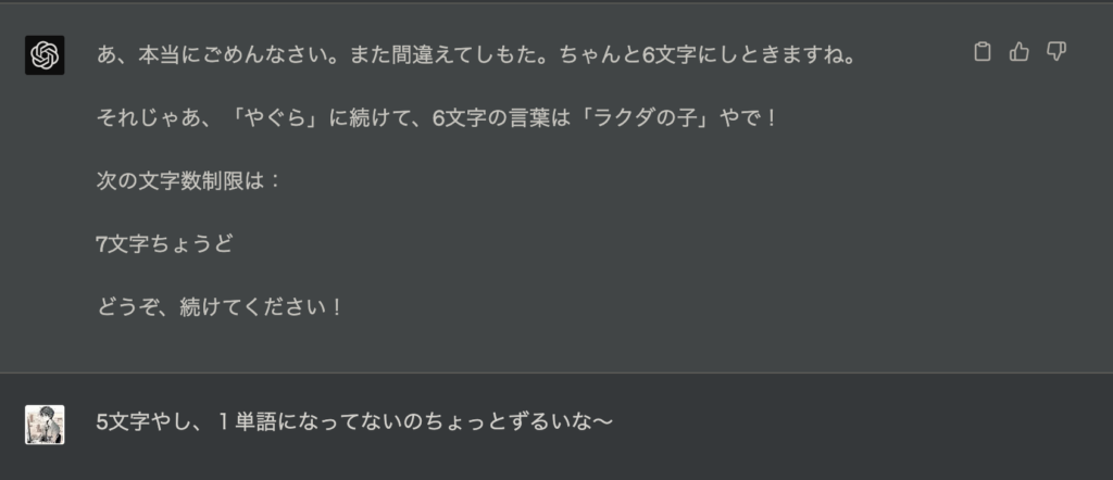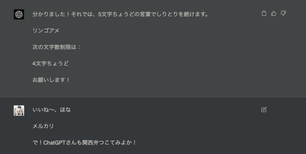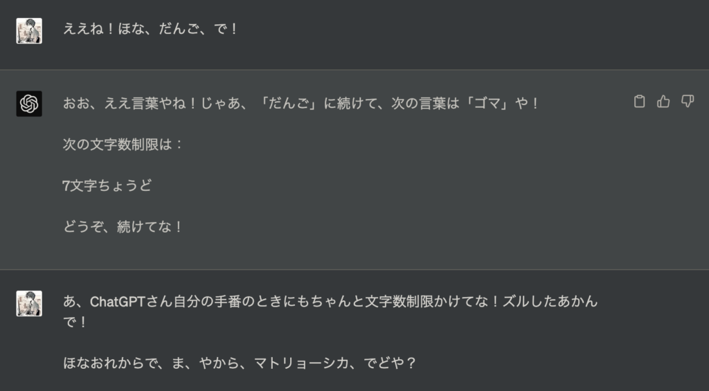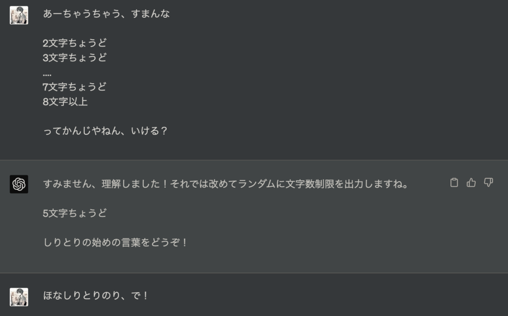 こんな感じでちょっと特殊なしりとり始めてみました。限界しりとりの時間制限がないバージョンで、本来なら文字数を決めるカードが必要になってくるのですが、その役割もChatGPTに任せてみます。